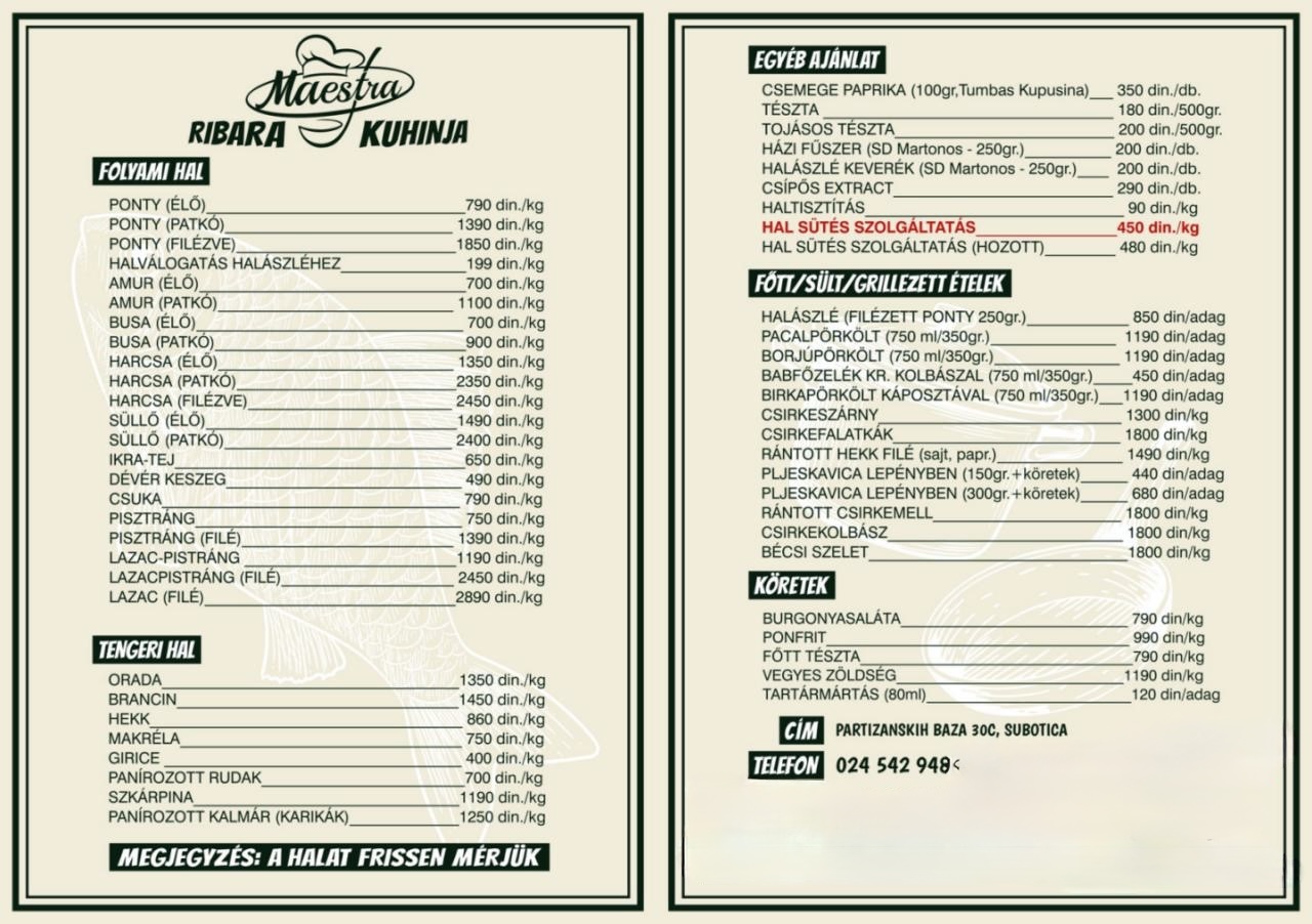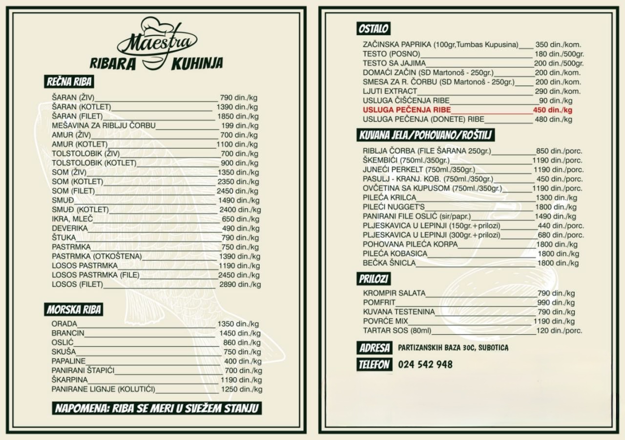 "MAESTRA RIBARA I KUHINJA" je mesto gde se tradicija dobre kuhinje i mirisi sveže pripremljene ribe susreću u savršenom zalogaju. Sa posebnom pažnjom i iskustvom bavimo se pečenjem ribe, uslužnim pečenjem i pripremom domaćih jela, uz poštovanje autentičnih recepata i proverenog kvaliteta namirnica.