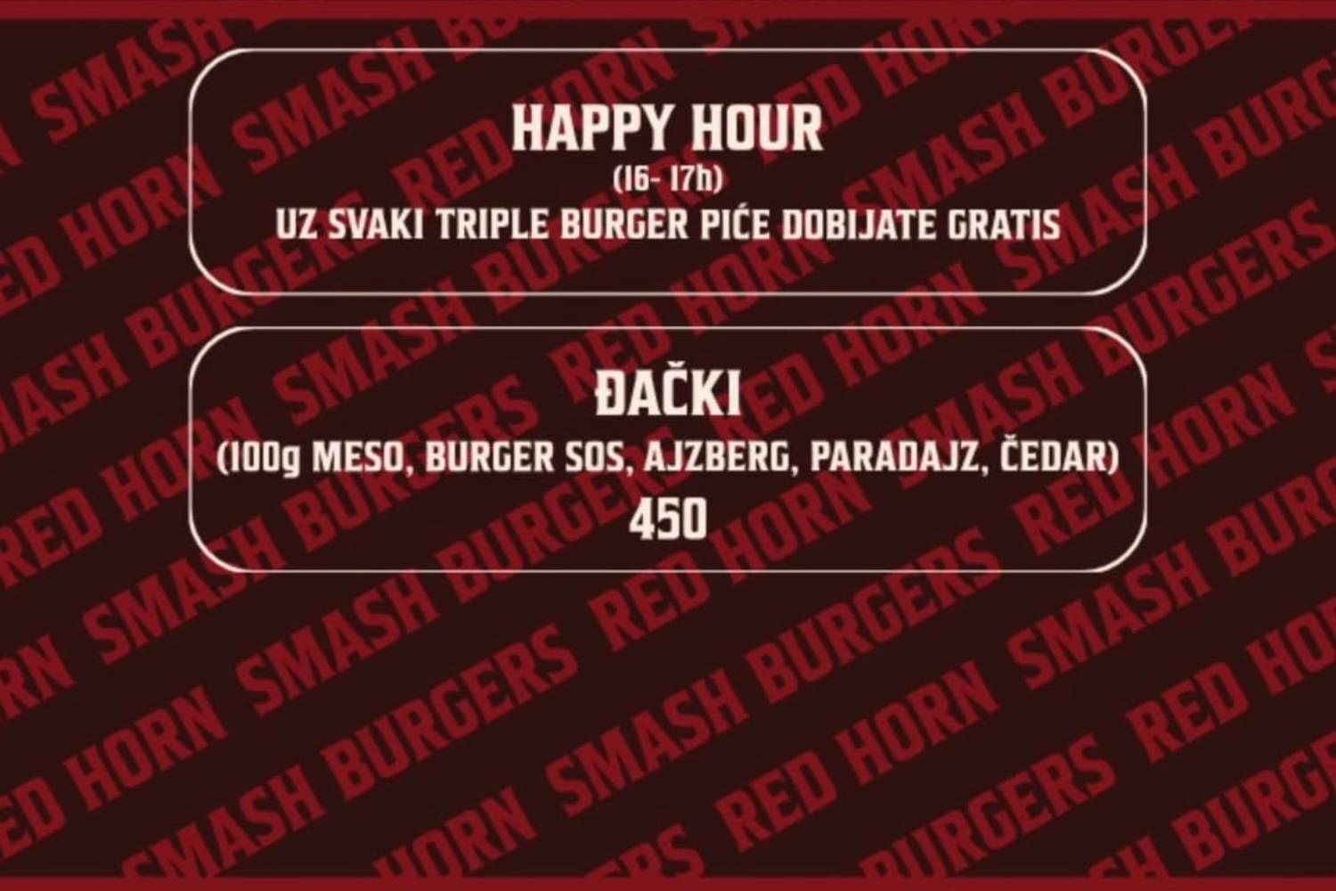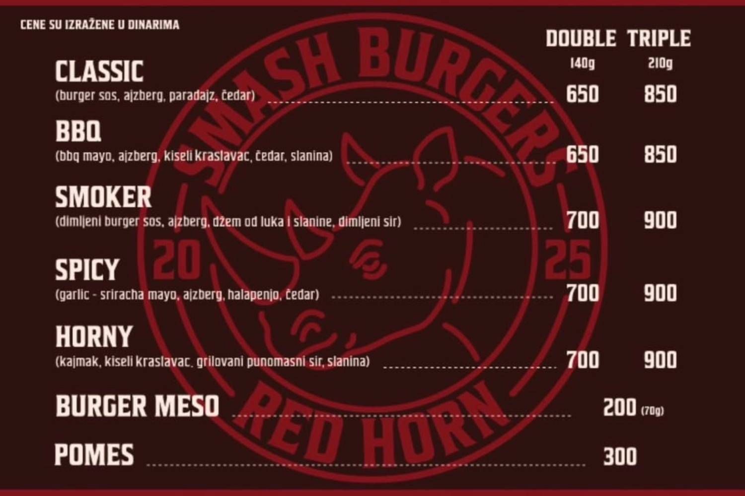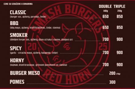 Dobrodošli u "RED HORN" – mesto gde se strast prema burgerima pretvara u ozbiljan ukus. Naši smash burgeri pripremaju se od pažljivo biranog mesa koje se peče na visokoj temperaturi kako bi dobilo savršenu karamelizovanu koricu, dok unutra ostaje sočno i bogato aromom.