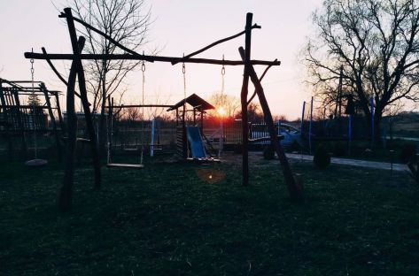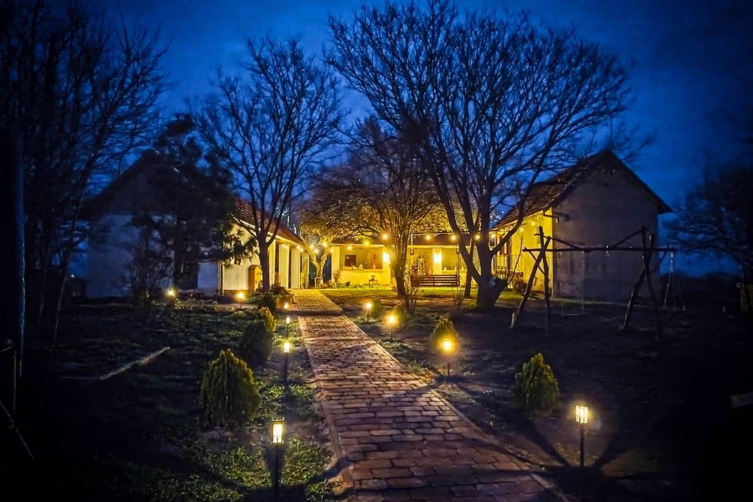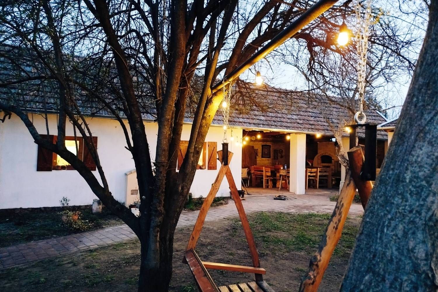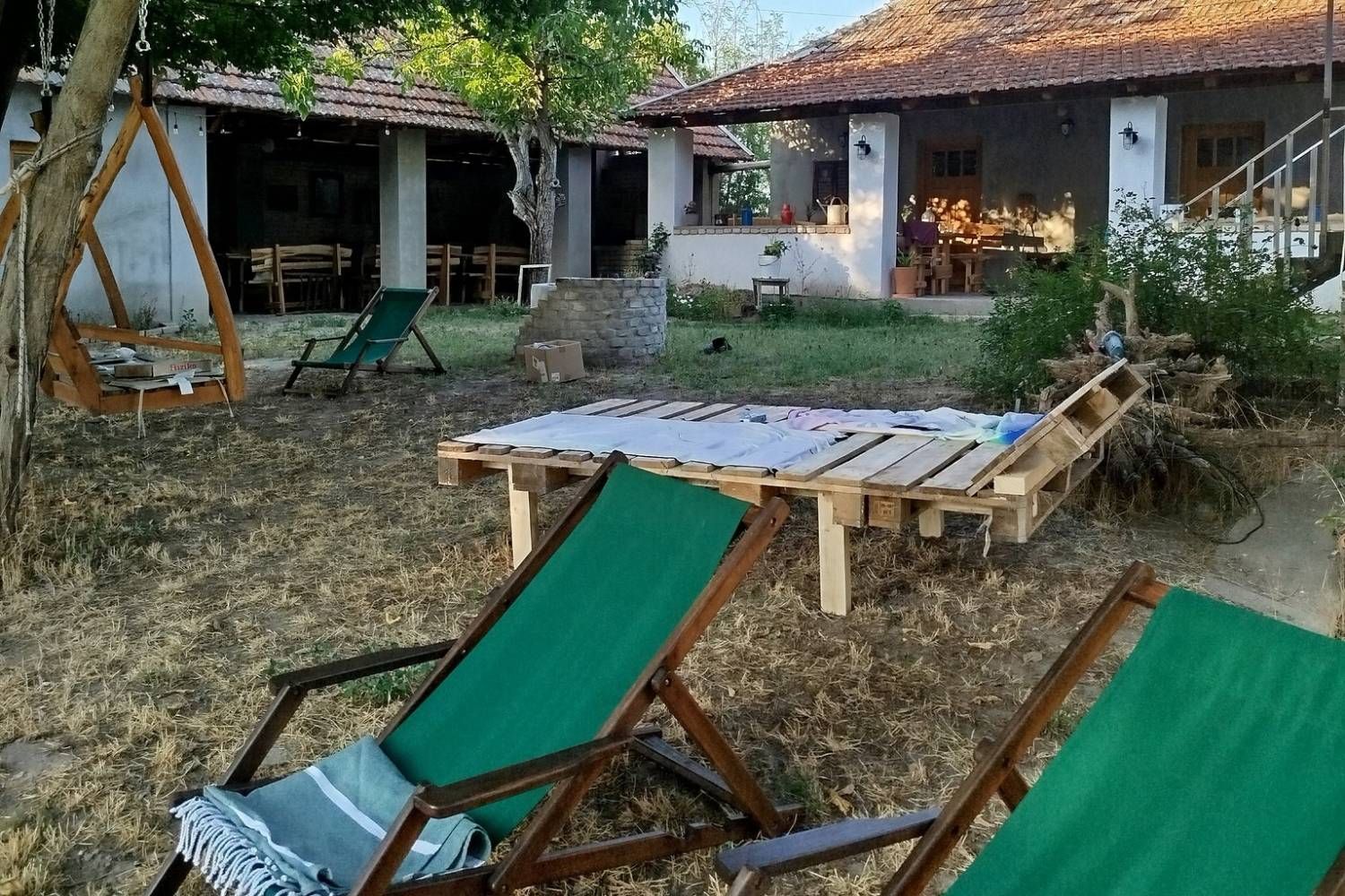 Prostrano dvorište obogaćeno je sadržajem za najmlađe – ljuljaškama, toboganima, trambolinom, pikadom i stonim tenisom – dok odrasli mogu uživati u miru, zelenilu i jedinstvenom umetničkom ambijentu koji prostoru daje posebnu energiju.
