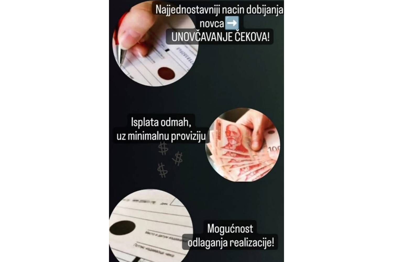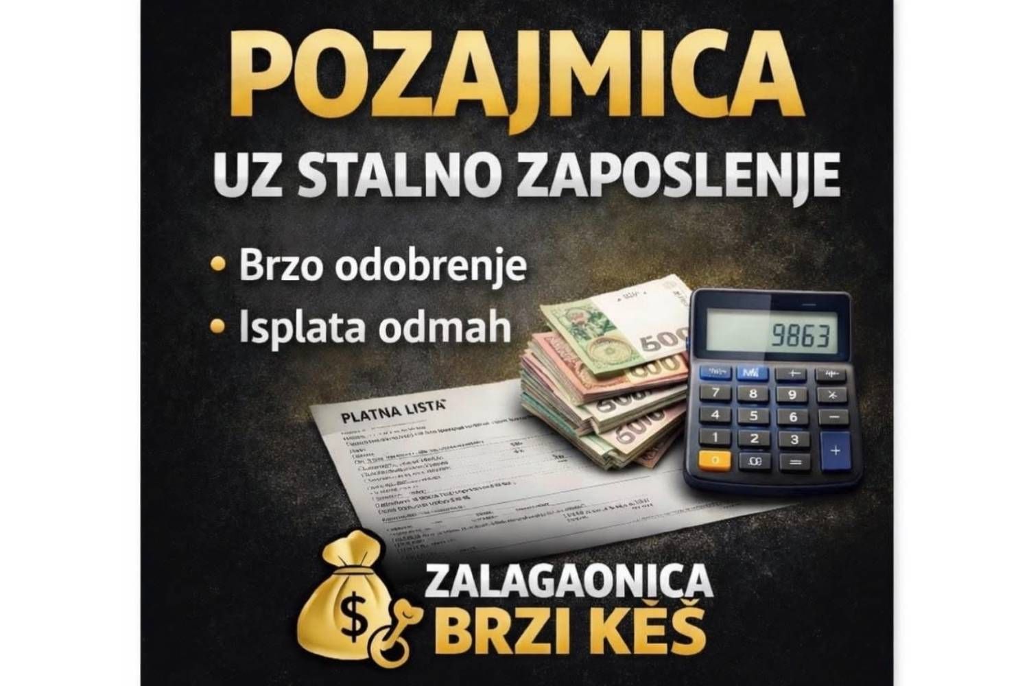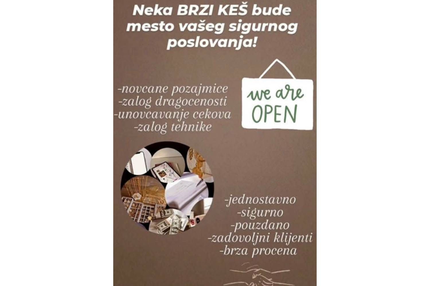 "ZALAGAONICA BRZI KEŠ" omogućava vam da do novca dođete odmah, uz minimalnu proviziju i jednostavnu proceduru. Pozajmice odobravamo na osnovu čekova, zlata, srebra, telefona, laptopova, automobila i drugih vrednosti.